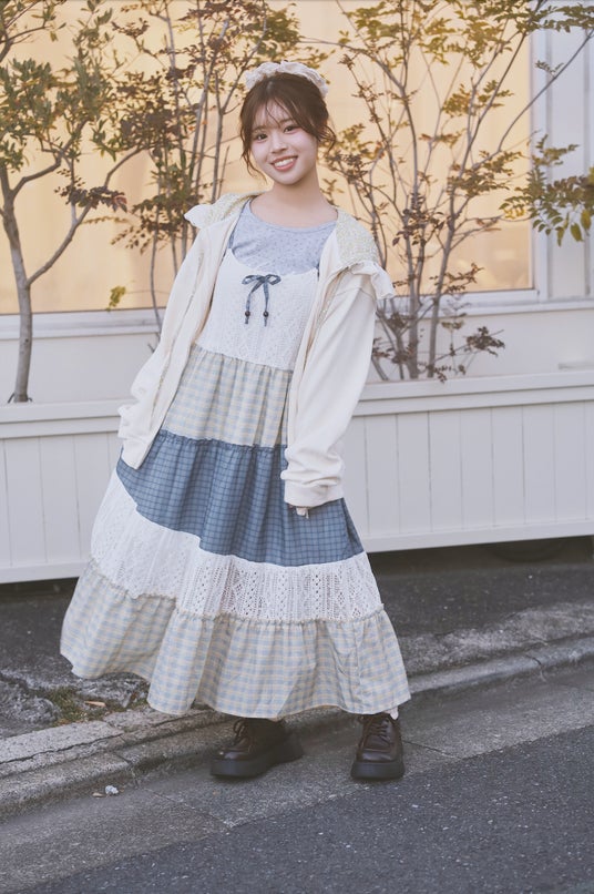パッチワークが特徴のロング丈のワンピースや、オフショルニット、ミニスカートで甘い雰囲気のガーリーコーデ。