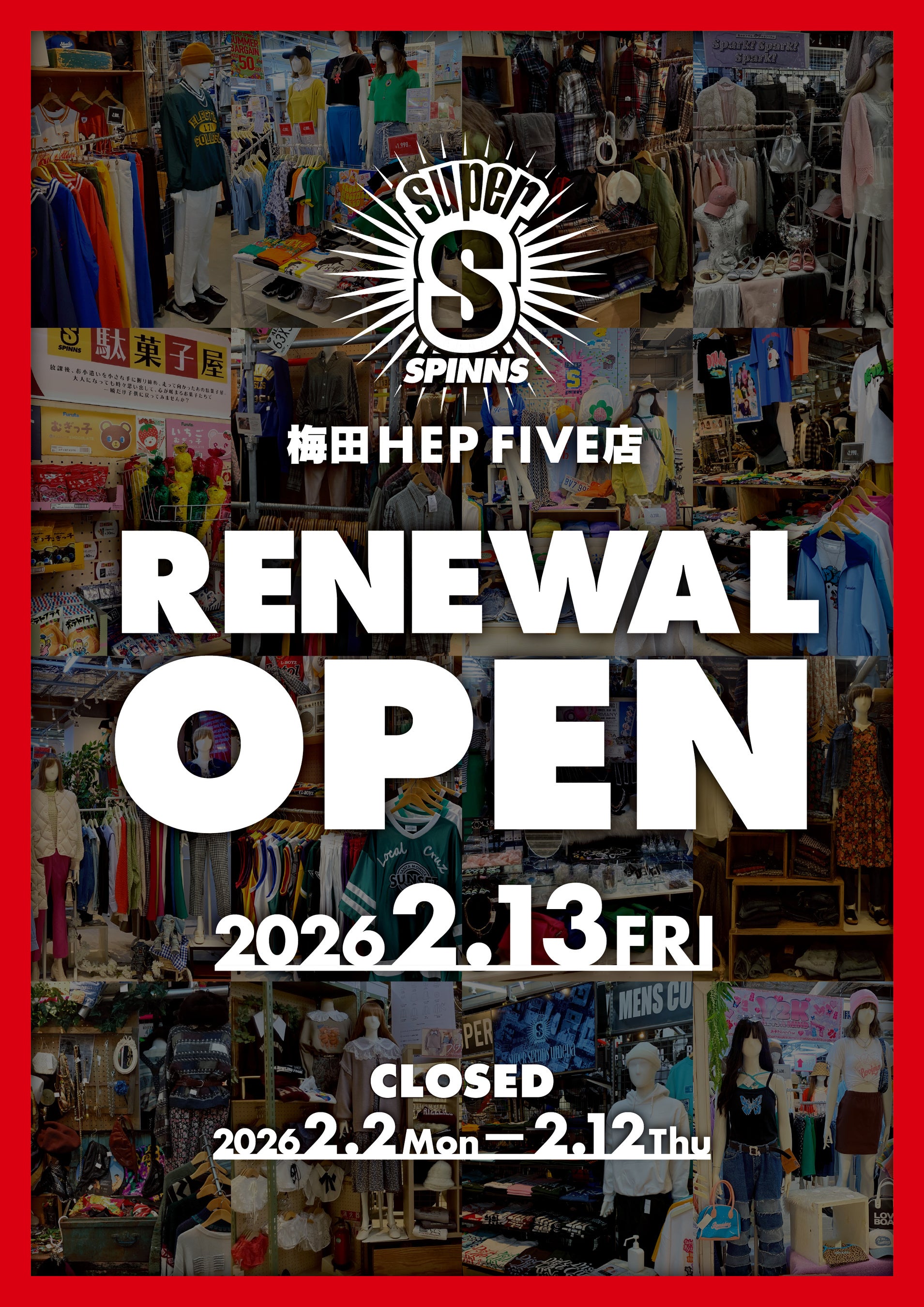 大阪最大級のSPINNSとして展開する「SUPER SPINNS梅田HEP FIVE店」(所在地:大阪府大阪市北区)は2025年11月6日にオープン10周年を迎え、2026年2月13日(金)にリニューアルオープンいたします。