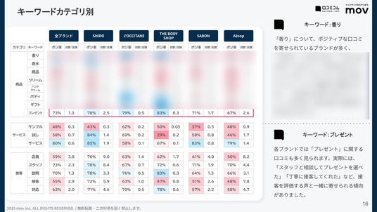 各ブランドでは「香り」「プレゼント」に関する口コミが多く見られました。キーワード「プレゼント」で実際に寄せられた口コミを見てみると、「スタッフと相談してプレゼントを選べた」「丁寧に接客してくれた」など、接客を評価する声と一緒に寄せられる傾向がありました。「香り」についても、各ブランドの評価が明らかとなりました。