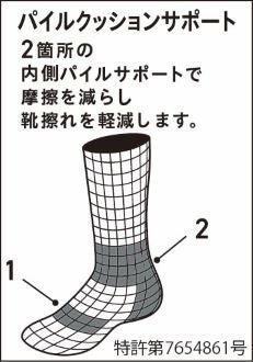 特許取得の2か所のパイルクッションにより、足と靴の摩擦が軽減され靴ずれを防止。甲サポート構造とニューロッソ縫製も採用し、抜群の履き心地を実現しています。