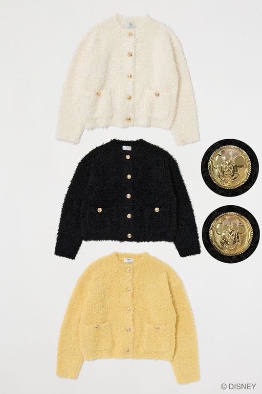 3種類の様々な表情の糸を織り交ぜたニットカーディガンは、MICKEY MOUSE / MINNIE MOUSEのお顔を立体的に表現したオリジナル金ボタンがポイント。さりげなくもトレンド感のあるデザインに落とし込みました。