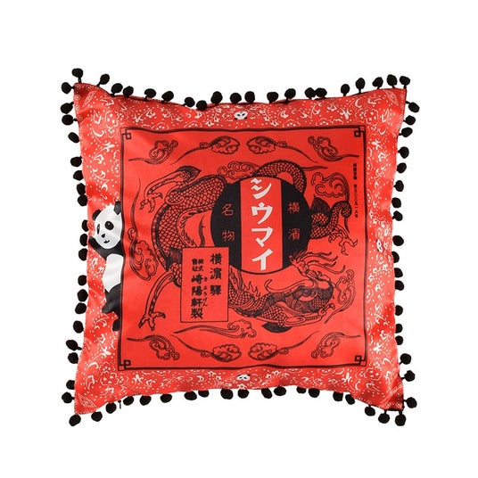 光沢のある生地にプリントを施し、ポンポンを挟み込んだ愛らしいクッションが完成。