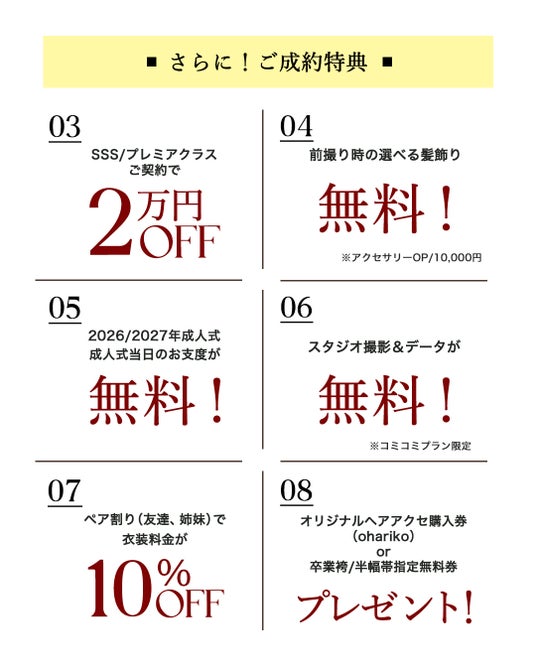 ご成約特典03)SSSクラス衣装、プレミアクラス衣装をご契約でさらに2万円オフに! 04)前撮り時の髪飾りがプレゼント(通常¥10,000→¥0に)05)2026年、2027年成人式当日のお支度が無料に! 06)スタジオでの前撮り&データお渡しが無料に! 07)ペア割で衣装料金がさらに10%オフに!(姉妹、ご友人とご利用くださいませ。 08)選べる特典も!aimmeオリジナルヘアアクセ購入券or卒業袴半幅帯指定料金