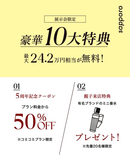 01)イベント契約でプラン料金が50%オフ(コミコミプラン対象) 親子来店特典02)人気ブランド香水を先着20名様にプレゼント