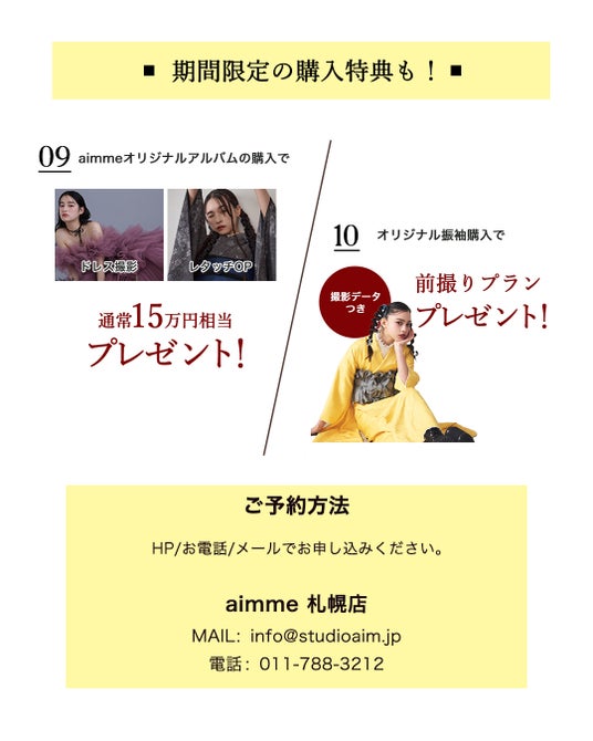 09)aimmeオリジナルアルバムをご購入で選べる特典が!ドレス撮影1着無料orプレミアレタッチオプション 10)aimmeオリジナル振袖をご購入で前撮りプランプレゼント!