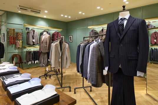 素材にこだわった金のスーツをはじめとした上質スーツ・シャツを表現するディスプレイを設置。上質・本物志向のお客様のニーズにお応えできる売り場を展開しております。銀座本店だけのインポート素材のスーツや革小物など特別な品揃えをご用意しております。