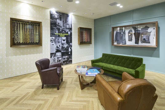 そして、この度新たに「街の総合洋品店」をキーコンセプトに店内売場環境においてフルリニューアルを図りました。入口からオーダーコーナーまで伸びるレッドカーペットと木調の内装・什器が上質感を演出します。そして、新たな商品構成を実現するためレディースの売場を約1.7倍に拡大。メンズコーナーにおいてはコーディネートテーブルとインナー・シャツを中央に配置することで、ビジネス・カジュアルともにアイテムが選びやすく、会話をしながらお買い物を楽しんでいただける環境を整えました。そしてAOKI店舗では初めて全身のスタイリングが確認できる三面鏡をフィッティングルーム前に設置。大切な1着をゆったりと落ち着いた雰囲気で選んでいただける空間にするべく、レジカウンター横には重厚感のあるインテリアに囲まれたヘリテージラウンジを新たに配置いたしました。