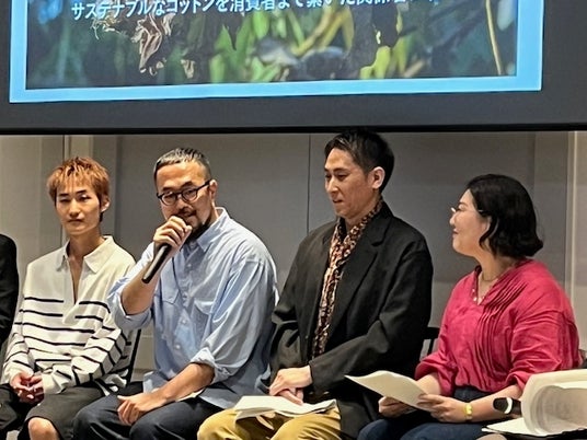 続く、トークイベントでは、スタイレム瀧定大阪(株)、タキヒョー(株)、WWFジャパンの皆さまとともに、企業を原材料生産の栽培という「農業」にまで突き動かしたもの、具体的な国内外の取り組み、現状の課題や思いをそれぞれに話し、ファッションのサステナビリティに関わる学生たちも参加し、率直な意見を交換しました。