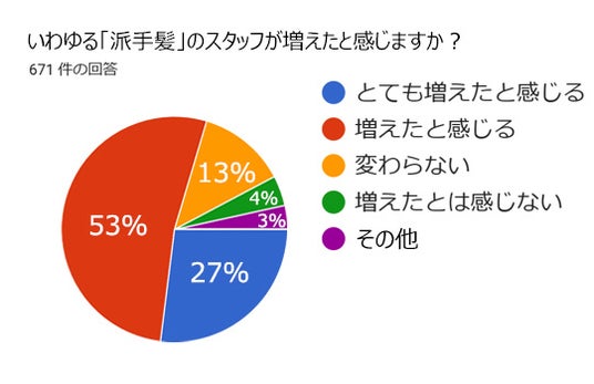 「身だしなみ基準が改定され、実際にヘアカラーを変えた」と答えるスタッフは全体の50%、「“派手髪”のスタッフが増えたと感じる」と回答したスタッフについては全体の80%を占めるという結果に。ヘアカラーを自己表現やファッションの一部として楽しむことはもちろん、職場としての満足度向上やコミュニケーションのきっかけにもなっているなど、ポジティブな声が集まる一方で、ヘアケアへの意識の変化もあるようです。