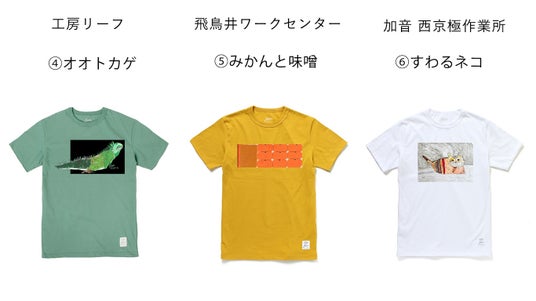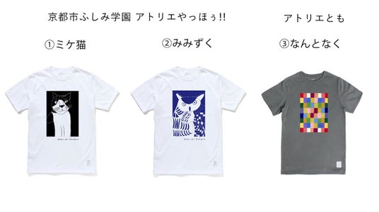 今年で4年目となるTシャツフェアは京都市内の登録事業所から応募いただいたアート作品を商品化しました。本取り組みを通じて、商品の企画・製造・販売における参考フレームとなるよう、事業所のより良い仕事づくりを支援するほか、販売した売上の一部がロイヤリティとしてアート作品を提供した事業所に支払われます。製造は京都発チャリティ専門ファッションブランドJAMMIN合同会社が担当しています。
