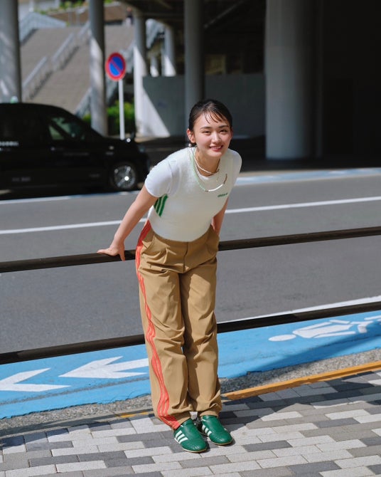 「今回のキャンペーンビジュアルで着用したシューズ達は、履いた瞬間から足にすっと馴染んで、驚くほど履き心地が良かったです。撮影では、シューズに合わせて様々なスタイリングを体験させていただいたのですが、中でもネイビーを基調にした、スポーティーさとドレッシーさが絶妙にミックスされたコーディネートがとても気に入っています。自分ではなかなか思いつかないスタイルだったので、すごく勉強になりましたし、真似してみたいと思える発見がたくさんありました!シンプルで洗練されたデザインのシューズだからこそ、幅広いファッションにマッチして、毎日のコーディネートが楽しくなりそうです。」