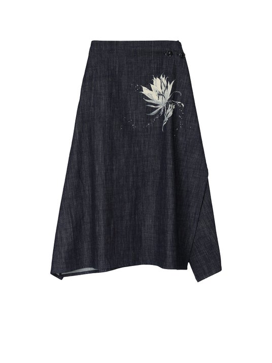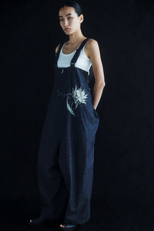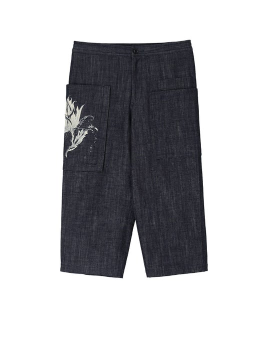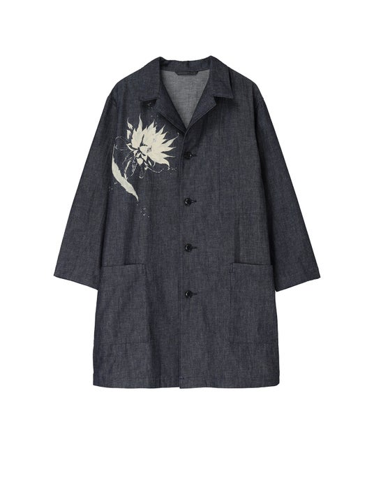 デニム生地にサボテンの花を抜染プリントし、柄に合わせてビーズが散らばるように刺繍を施した。