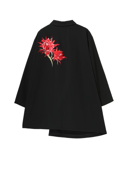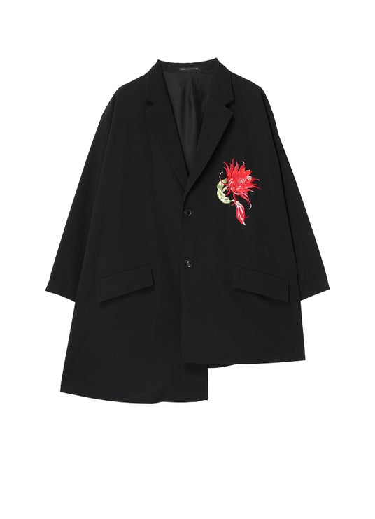 立体的なボリュームと温かみ、微妙な個体差のある手振り刺繍を施したウールギャバジンジャケット。刺繍は角度によって表情や色合いが微かに揺らぐ。アシンメトリーなシルエット。
