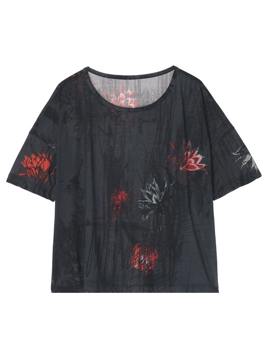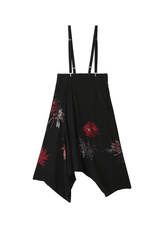 サボテンの花を不規則に配したブラウスとサスペンダー付きパンツ。光沢と落ち感のあるキュプラ素材に花のトーンの差や掠れ感が奥行きを描く。