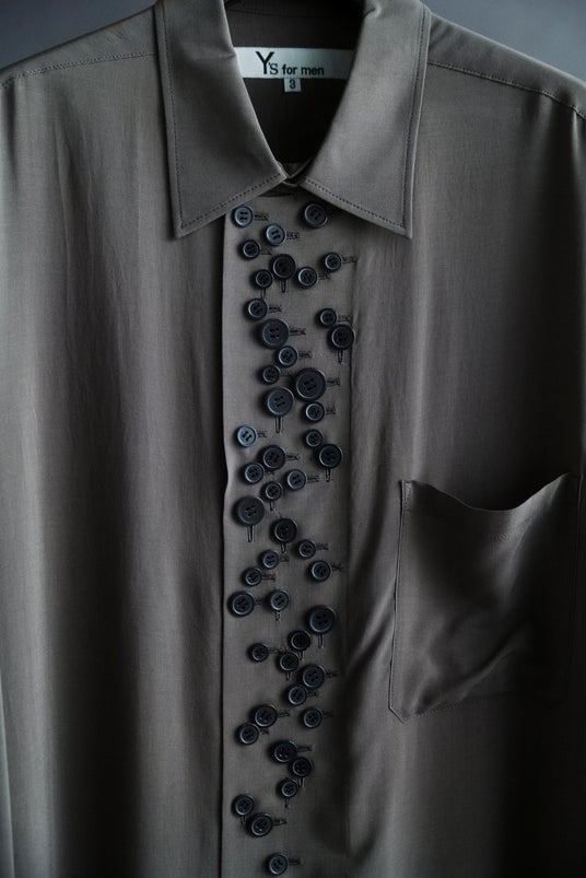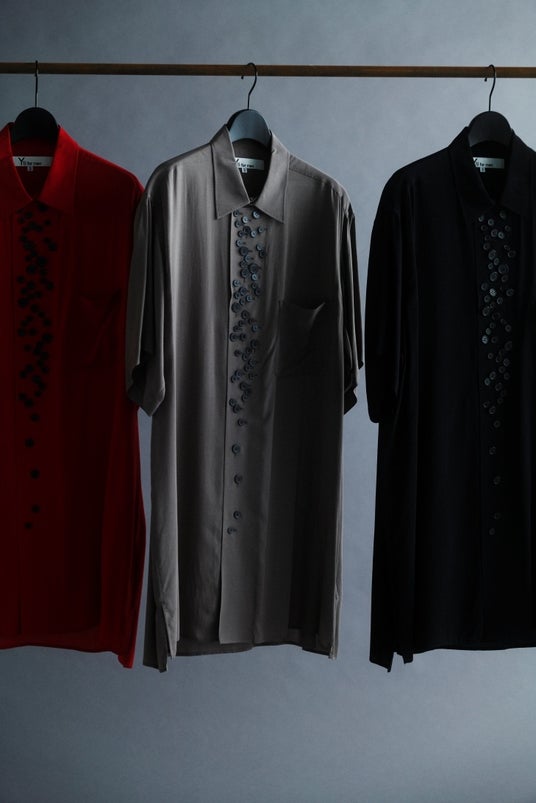 前身頃に多数の釦を配した半袖シャツは、光沢としなやかなドレープ性のある表情を備える。釦は単なる装飾にとどまらず、留め方や開き具合によってシルエットや表情に変化をもたらす。