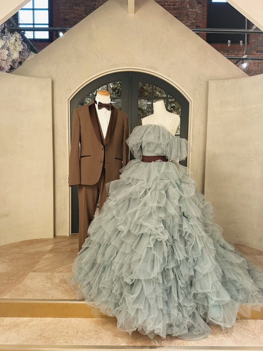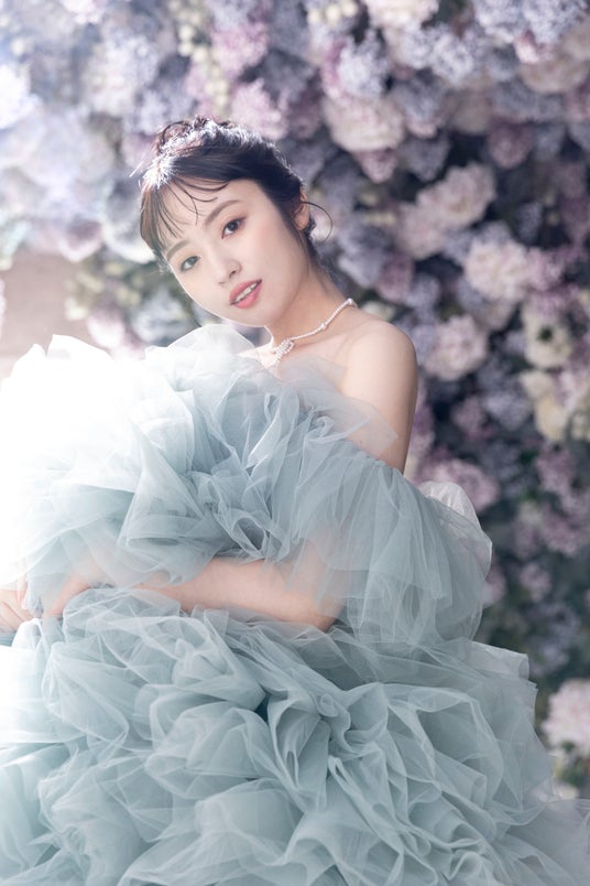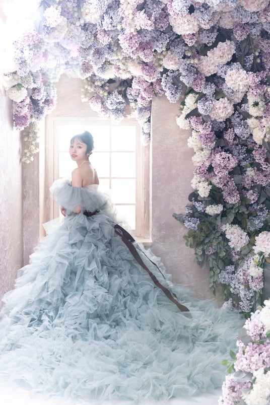 繊細なミントグリーンのチュールが幾重にも重なり合い、まるで花のように咲き誇るシルエットを描き出します。
