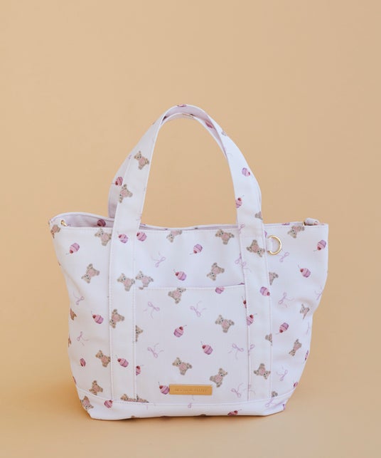 そのほか、リボンとカップケーキの甘いモチーフを組み合わせたMaison de FLEURオリジナルの総柄プリントのバッグと巾着ポーチもご用意。上品な優しいピンクの色合いにこだわりました。