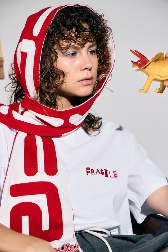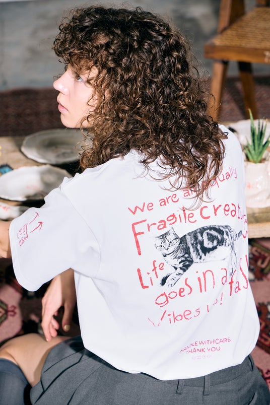 「こわれやすいいきもの」をコンセプトに、命のはかなさや存在の尊さを表現した作品を発表してきたアーティストFRAGILEが、PROJECT Uのためにグラフィックアートとメッセージを描き下ろしました。その独創的な世界観は、Tシャツやニット、スウェットといった日常のワードローブに落とし込まれ、身にまとうことでアートをより身近に感じられるコレクションとなっています。