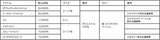 ジャケットはノーカラーとダブルブレストデザインの2型、ボトムはすっきりとした装いが叶うストレートパンツと、ハンサムなワイドパンツ、上品なロングタイトスカートの3型をご用意。ジレも加わり様々な着こなしがお楽しみいただけます。ベーシックな紺色、春らしさを感じるオフホワイトとベージュの3カラーを展開。