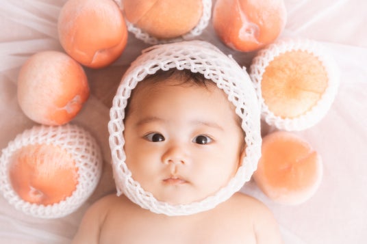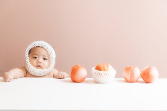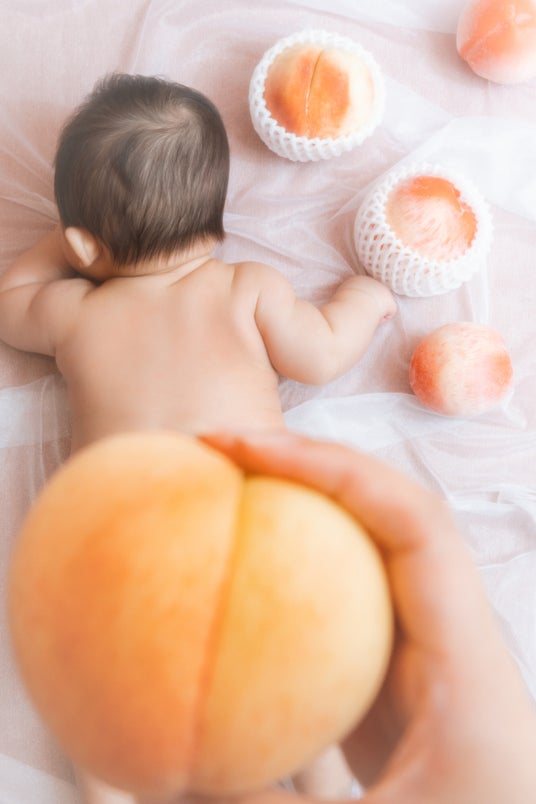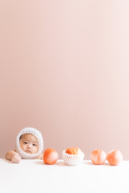 赤ちゃんのかわいらしさ・柔らかさが活きた斬新なベビーフォトアイデア!色鮮やかなフルーツを組み合わせたユニークな「フルーツコレクション」フォトに、丸く柔らかな"桃"が登場