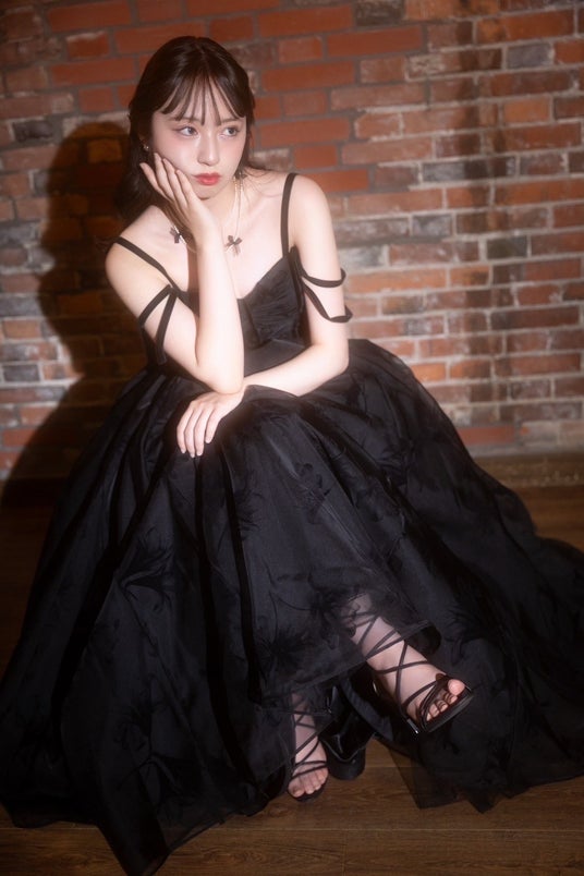 袖やチュールを組み合わせてシックで可愛らしくも美しくも着こなせる、麗しいデザイン性と色合い。