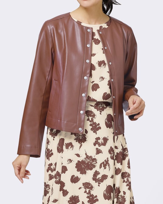 ノーカラーのすっきりとしたデザインが、上品な印象を与えます。ストレッチ素材の軽い着心地で、羽織るだけで旬のレザー調スタイルを楽しめます。