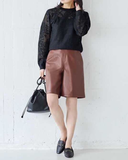 軽快なショート丈とレザー調の質感が、シンプルコーデに大人のアクセントをプラス。動きやすく、アクティブな日にもぴったりです。