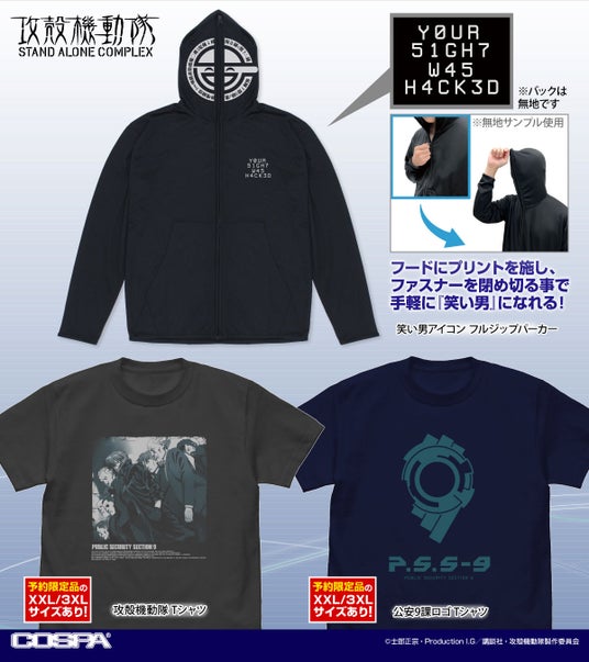 公式キャラクターアパレル・グッズのCOSPAブランドより『攻殻機動隊 STAND ALONE COMPLEX』新作アイテムが多数登場。笑い男アイコン フルジップパーカーは、フードを閉め切ることで劇中さながらに“笑い男にハックされた”かのようになれるアイテム。笑い男のアイコンは他にもTシャツやステンレスマグカップなど多数展開。