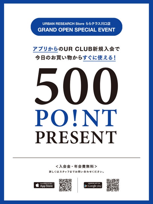 アーバンリサーチ公式アプリからUR CLUBに新規入会いただいた方へ、今日のお買い物からすぐにお使いいただける500ptをプレゼントいたします。新規入会はこの機会がおすすめです!