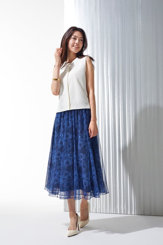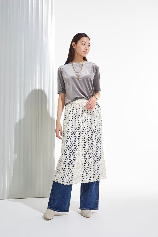 立体感のあるフラワーモチーフレースの主役級スカート。夏は薄手のボトムスと合わせて、秋はデニムと合わせて、気温に応じたレイヤードスタイルで印象を変化させて楽しむことができます。