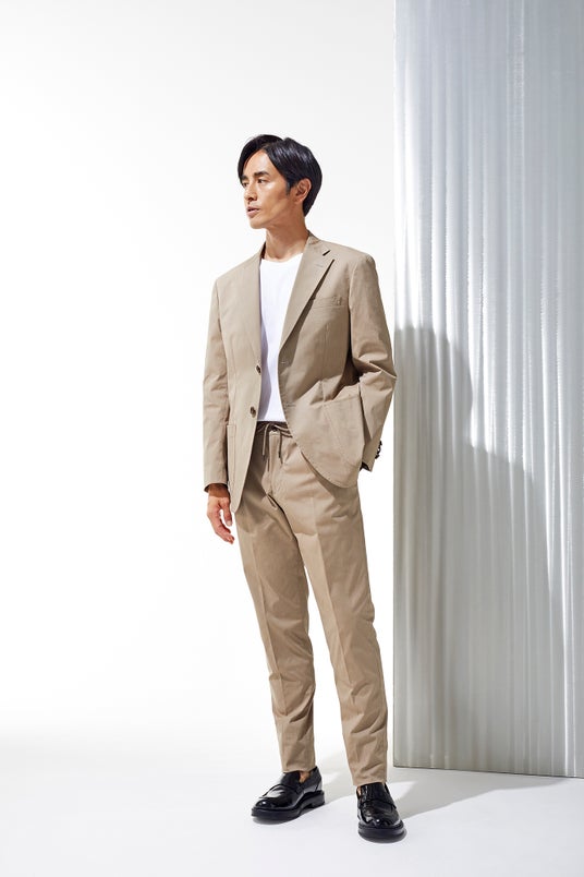 軽量素材で仕立てたセットアップ。コットンベースの生地は秋口でも違和感なく、