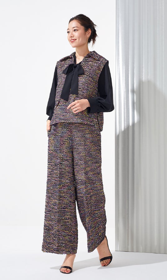 見た目よりも着心地、触り心地が軽やかながらも、立体感のあるディテールと色合いで、秋のモードを先取りできるセットアップ。