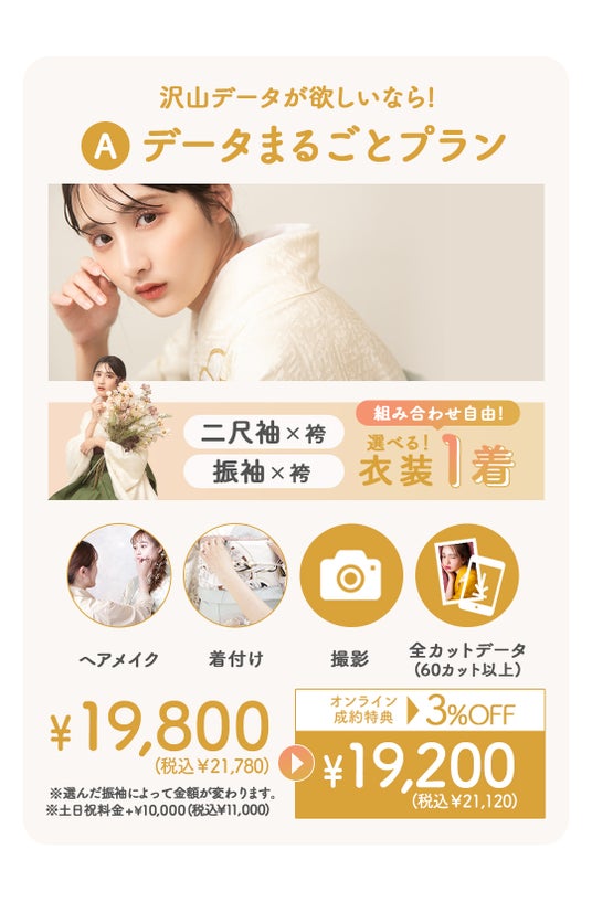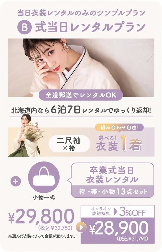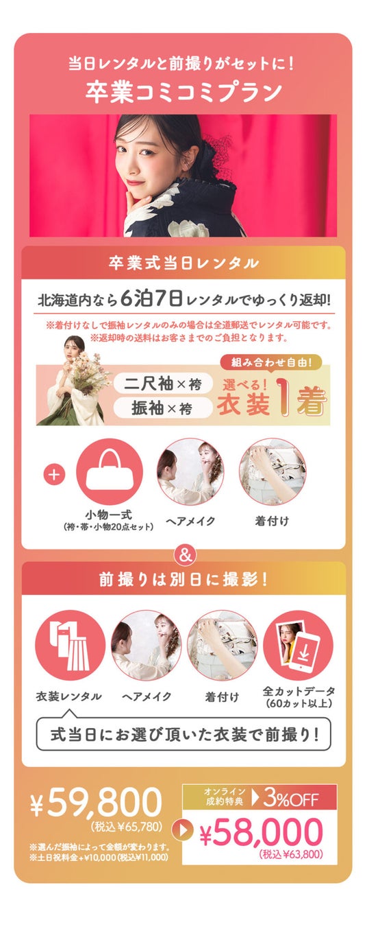 ・成人式前撮り、レンタルと同時契約で卒業プラン料金が50%OFF