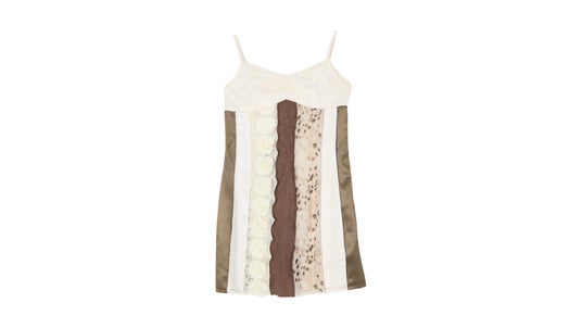 異なる素材を縦に切り替えたデザインが印象的なキャミソールワンピースは、今回のコレクションの中でも特に存在感のある一着。膨大な数の生地から選び抜いたこだわりがギュッと詰まっています。透け感のあるレースや立体的な生地を組み合わせることで、動きのある表情を生み出しています。あえてタイトにしすぎず、程よくゆとりを持たせたシルエットにすることで、リラックスして着られる着心地も実現。「1枚でさらっと着られる気軽さ」と「他にはないデザイン性」を兼ね備えています。