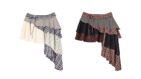 アイドル衣装から着想を得たミニスカートは、動きのあるシルエットが特徴的な一着。後ろやサイドに広がるデザインを取り入れつつ、取り外し可能なパーツによってシンプルなミニスカートとしても着用できる2WAY仕様になっています。異なる素材を組み合わせることで、立体感と遊び心をプラスしながらも、デイリーに取り入れやすいバランスに仕上げているのがポイント。生地のトーンはあえて落ち着かせることで、コーディネートしやすさも意識しています。