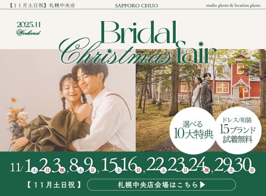 この度、2025年11月土日祝限定で、お得で楽しいブライダルフェアを札幌エリアの店舗で開催します。運命の一着を探している方、憧れのドレスを試着したい方は、この機会にぜひご来店ください。