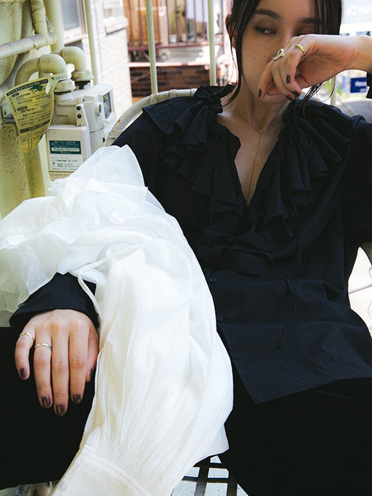 フリルがたっぷりな女性らしいブラウス。インラインではネル素材で出ているアイテムを、URBAN RESEARCHでは定番素材で別注。よりシーズンレスで合わせやすく仕上げました。ゴージャス過ぎないバランスのフリルと、合わせやすいBLACKとWHITEのカラーで、秋のコーデをお楽しみいただける一品です。