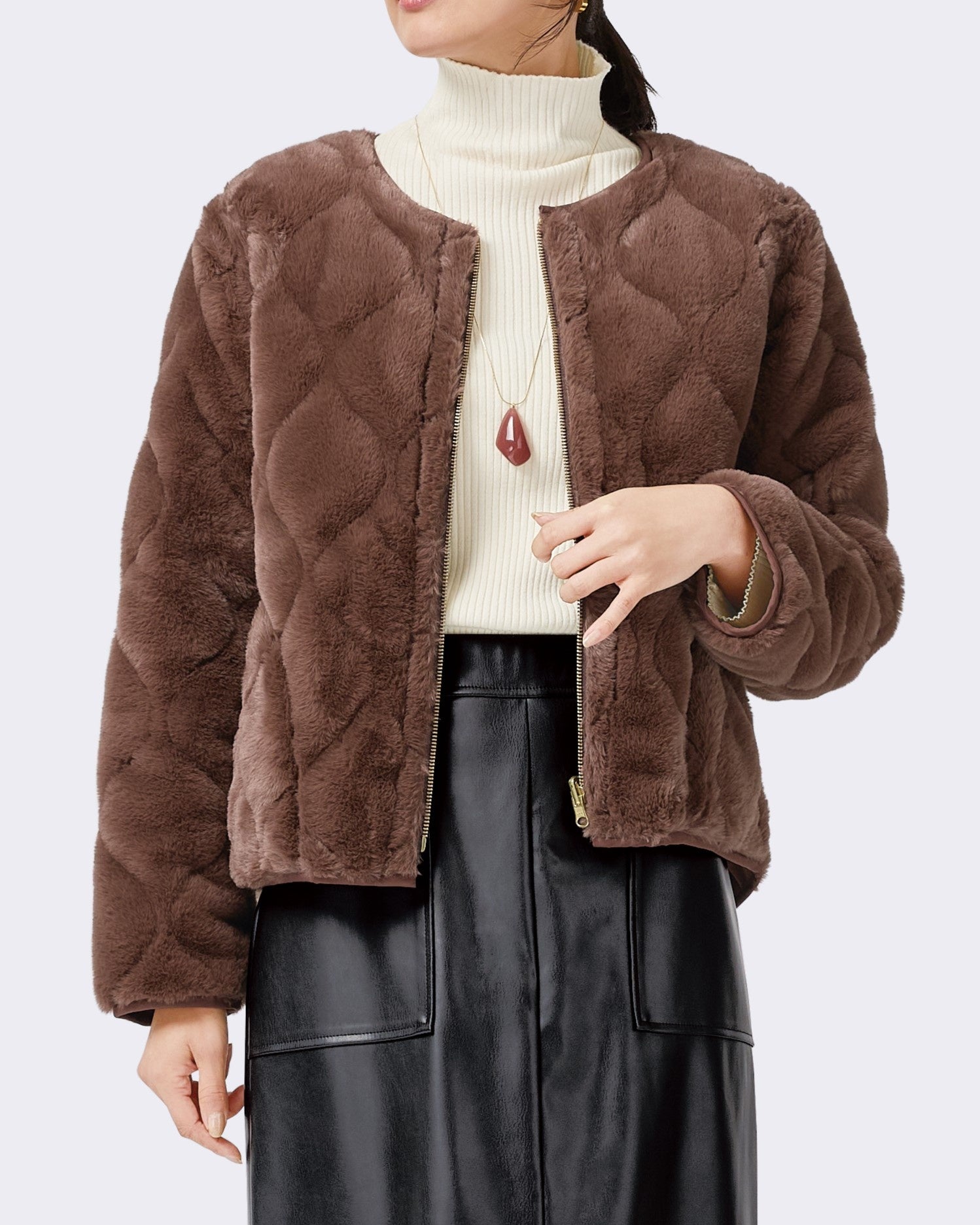 【ポイント】ふんわりとしたフェイクファーと、すっきりとしたキルト風デザインの両面を楽しめるリバーシブルコートです。1着で2つの雰囲気を楽しめるので、コーディネートの幅が広がります。