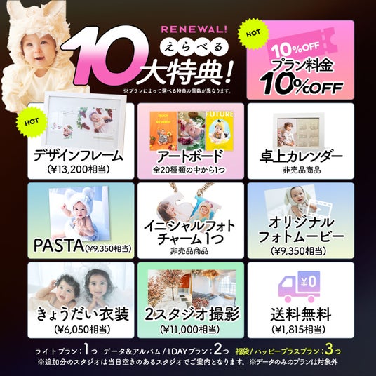 有限会社三景スタジオ(代表取締役:大西康弘)が運営する写真工房ぱれっとは、1歳お誕生日記念撮影(西岡店は全種目)を対象に、人気プランが10%OFFになり、非売品含む10大特典から最大3つ選べる週末限定のブラックフライデーキャンペーンを11月に緊急開催します。