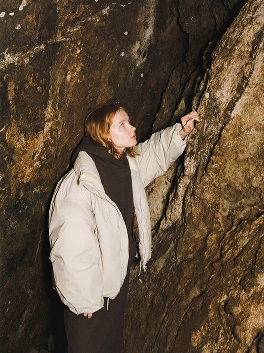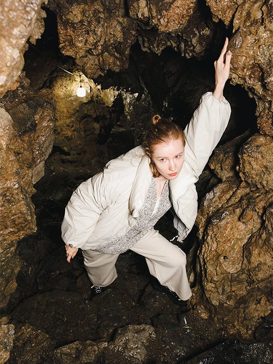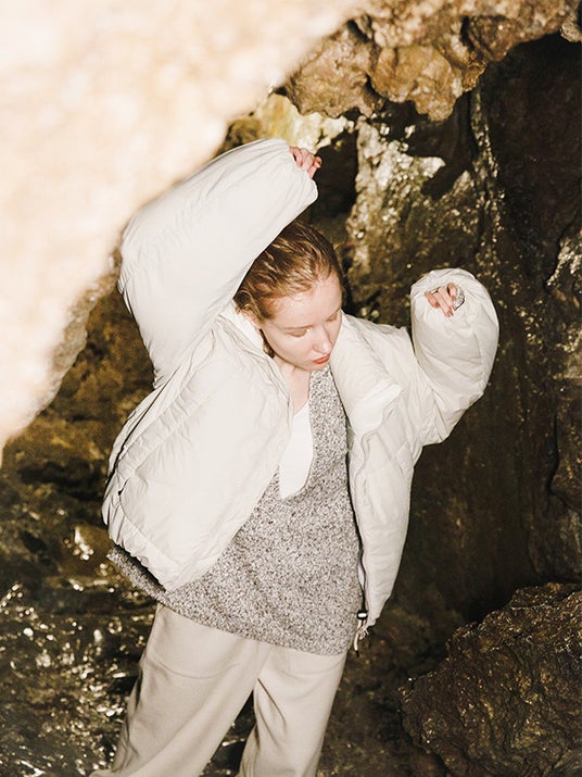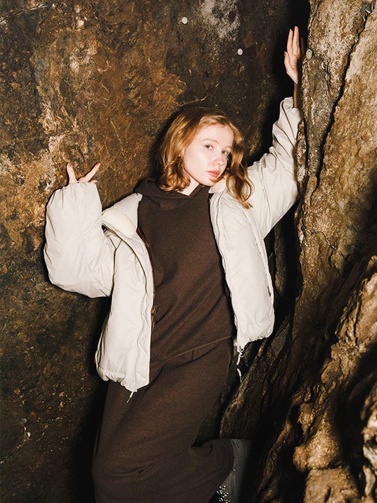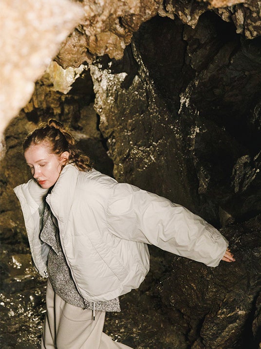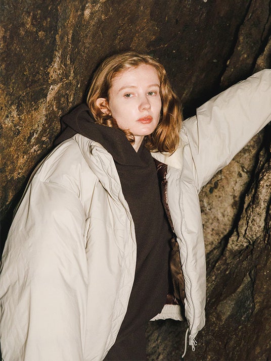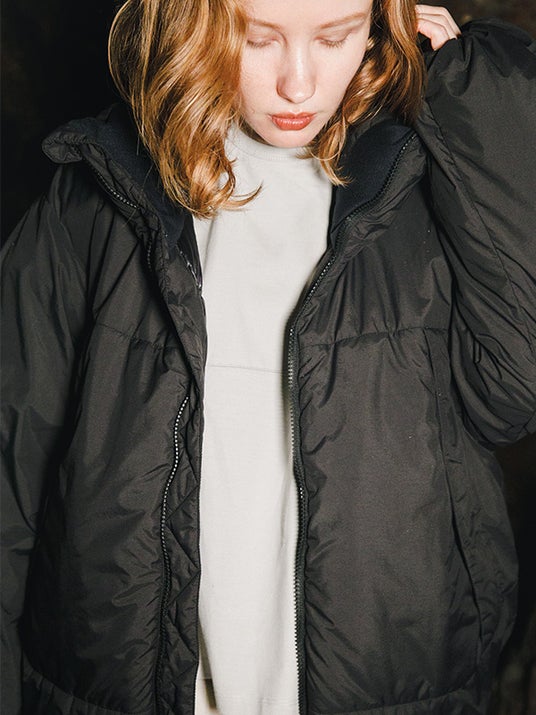 袖はあえて長めの裄丈に設定し、手の甲まで隠れるボリューミーなシルエットが特徴。リラックスした雰囲気と防寒性を両立しています。また、スタンドカラーにはしっかりとダウンを封入しており、顔まわりに程よいボリュームをもたせることで小顔効果も期待できるデザインです。