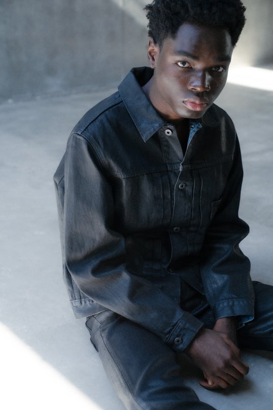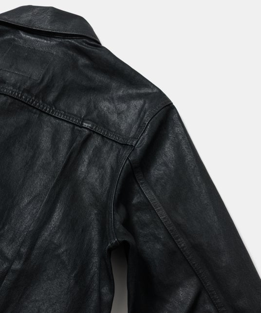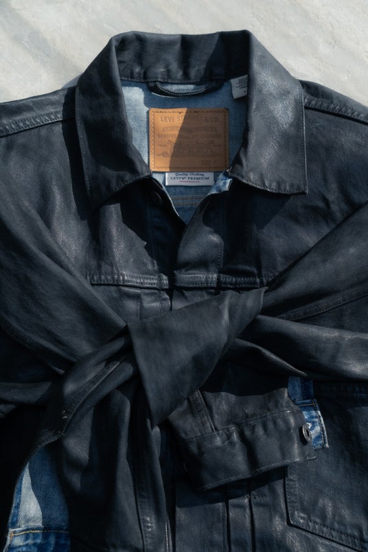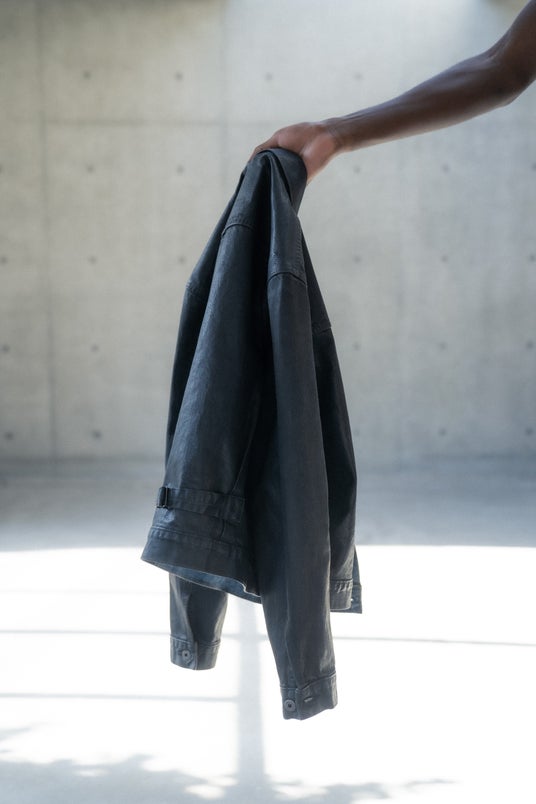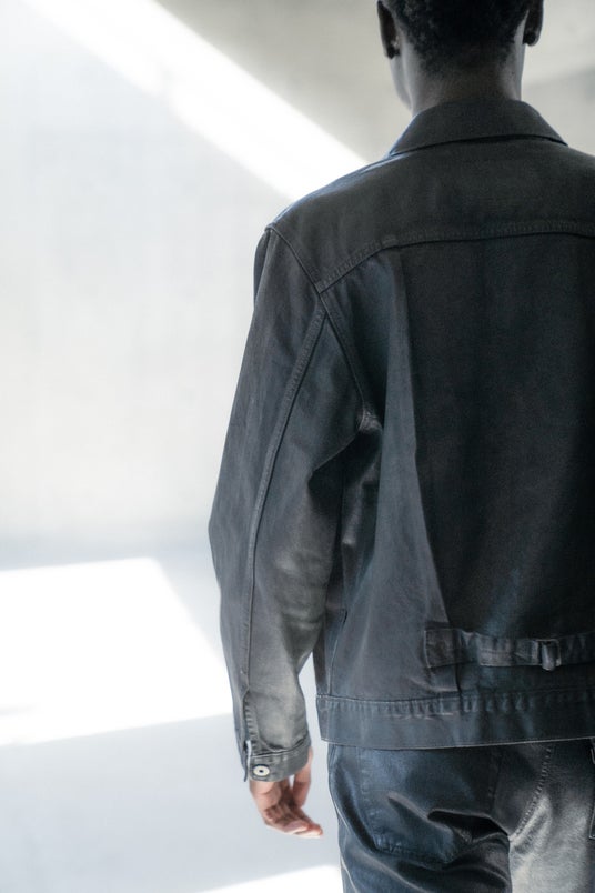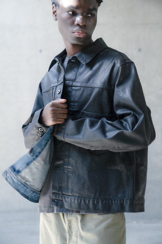 デニムのベースカラーにはウォッシュをかけたヴィンテージ風のライトインディゴカラーにし、その上にブラックのPUコーティングを施すことで、伝統的かつ前衛的でコンテンポラリーな風合いを表現。