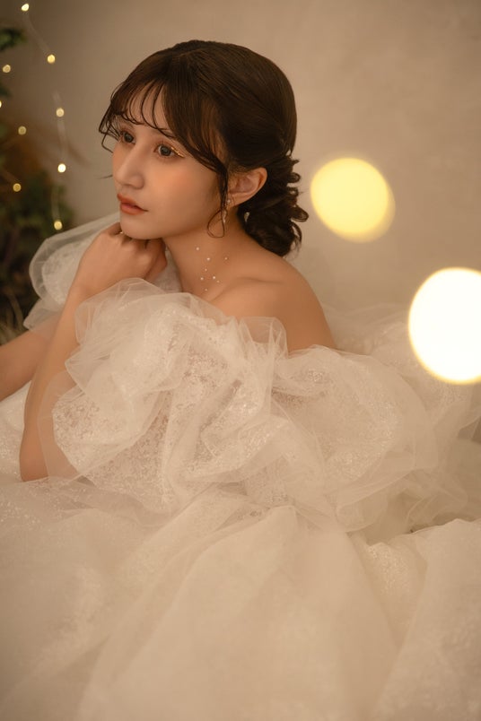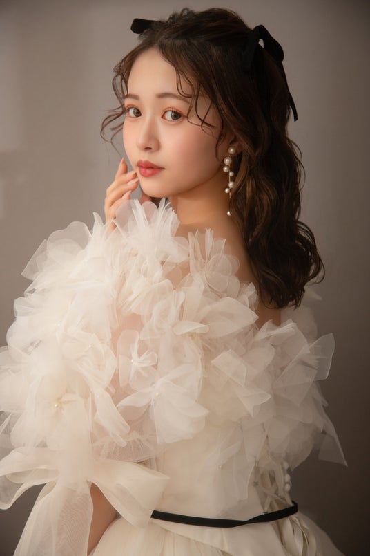 ハーフアップは、女性らしい柔らかさを残しつつ、フォト映えも抜群で、体験型のフォトウェディングにも最適です。