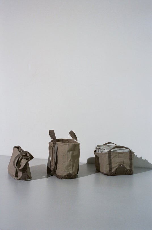 このコレクションでは、TEMBEAの定番であるショルダーバッグや長く親しまれてきたMARKET TOTE、アイコニックなBOOK TOTEを、サイズやディテールをMHL.らしいバランスで再構築しています。TEMBEAの特徴である、40~50年前の古い織機で織られた生地の耳(selvedge)は、切りっぱなしのような自然な表情を残しながら、デザインの一部として生かされています。一方で、MHL.の特徴である製品洗いを施すことで、使い込まれたような柔らかさと風合いを表現。時間を経て馴染むような質感を持つ仕上がりになりました。