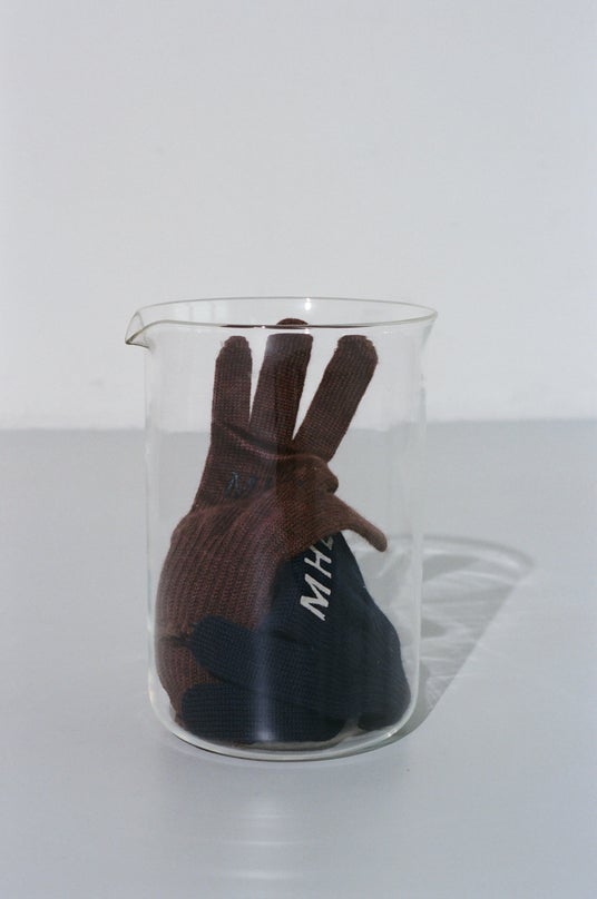 自転車に乗るシーンをイメージしたTEMBEAのCYCLE GUNTEを、ニュアンスのあるカラーリングのメリノウールを使用し、作業用の軍手のようにMHL.のロゴをラバープリント。