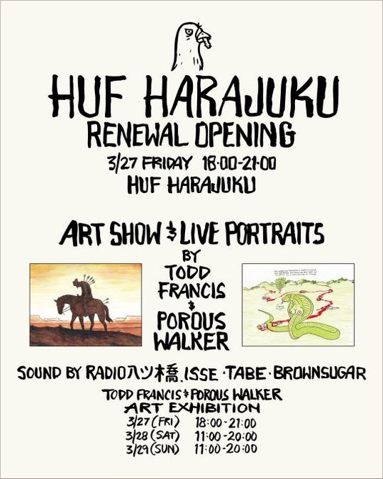 2018年の原宿店オープンから、店舗のアイコンとしてピジョンのモニュメントを手描けたTodd Francisが盟友のPorous Walkerと共に来日。日本初となるポートレートライブペインティングを披露します。また、オープンを記念して、Todd FrancisがデザインしたTeeシャツをHUF原宿店にて限定