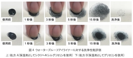 前述の検討結果を基に、簡易な処方で水性クレンジング料を作成してウォータープルーフタイプのアイライナーに対する実際の洗浄性能を評価しました(図4)。その結果、保湿剤としてシクロへキシルグリセリンを配合した処方Aは、高いメイク洗浄性能を有していることが分かりました。