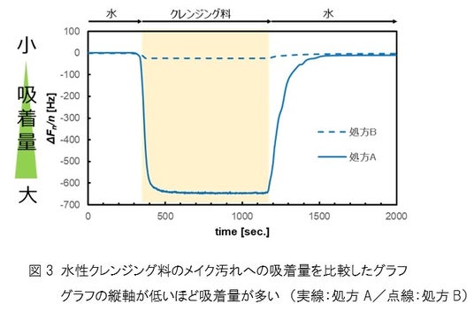また、実際に機器を用いてメイク汚れへの吸着量を評価した結果、保湿剤としてシクロヘキシルグリセリンを配合した処方Aは、処方Bと比べて吸着量が多いことが明らかになりました(図3)。