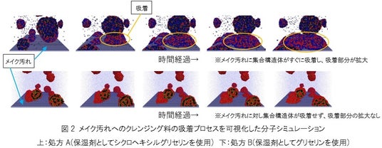 さらに、洗浄性能の違いが生じるメカニズムを明らかにするため、クレンジング料中の配合成分が形成する集合構造がメイク汚れにどのように吸着するのか調査しました。分子シミュレーションでメイク汚れへの吸着の様子を可視化した結果、保湿剤としてシクロヘキシルグリセリンを配合した処方Aは、直ちに図下部のメイク汚れに吸着したのに対し(図2上)、保湿剤としてグリセリンを配合した処方Bは、図下部のメイク汚れに対して球状の集合構造が直ちに吸着していないことが明らかになりました(図2下)。