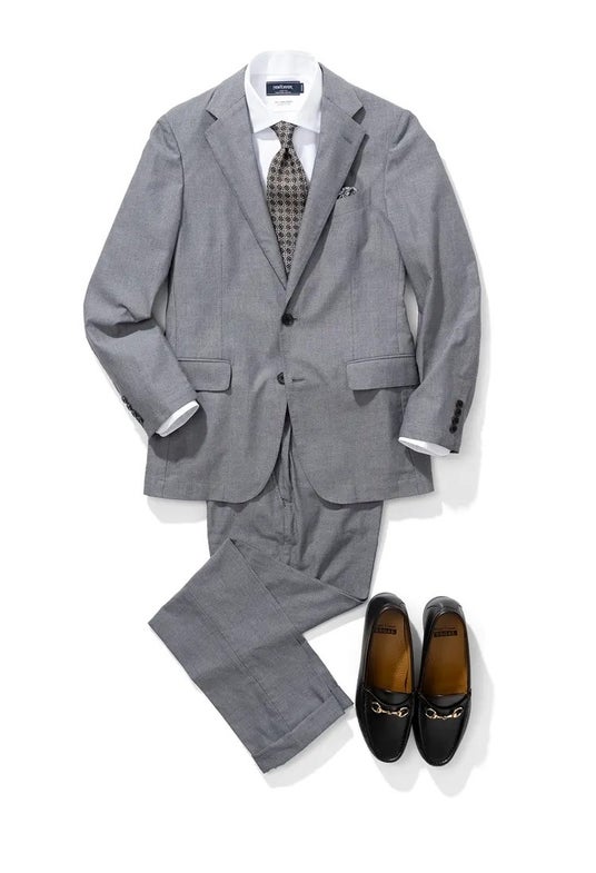 爽やかなライトグレーには、ネクタイ・チーフ・シューズでブラックを取り入れることでモダンなスタイリングに。今シーズンのモチーフ「アーキテクチャモチーフ」を採用したネクタイが、ラグジュアリーさをプラスします。