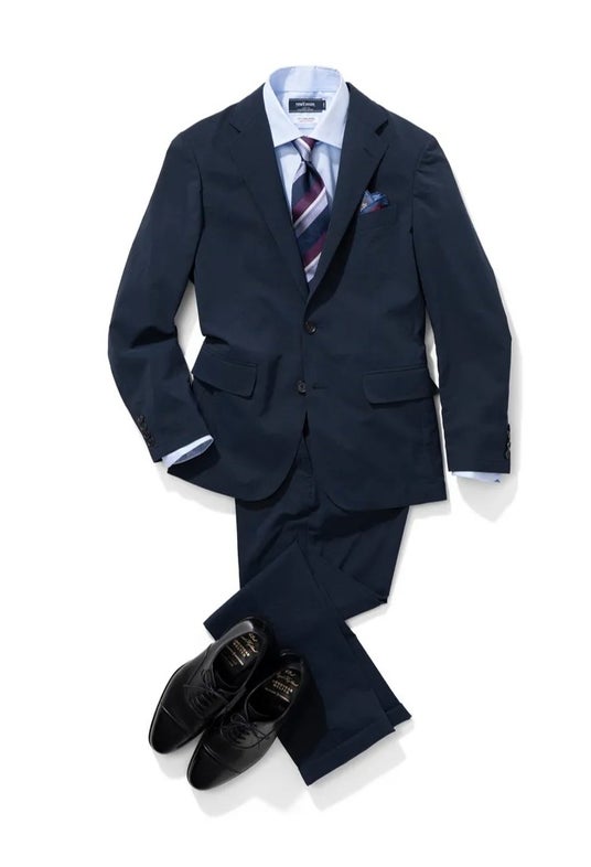 軽やかな仕立てのセットアップスーツも、タイドアップすることでしっかりとビジネス映え。ネイビー系でトーンを揃えることで、季節感も感じられる誠実な印象に仕上がります。